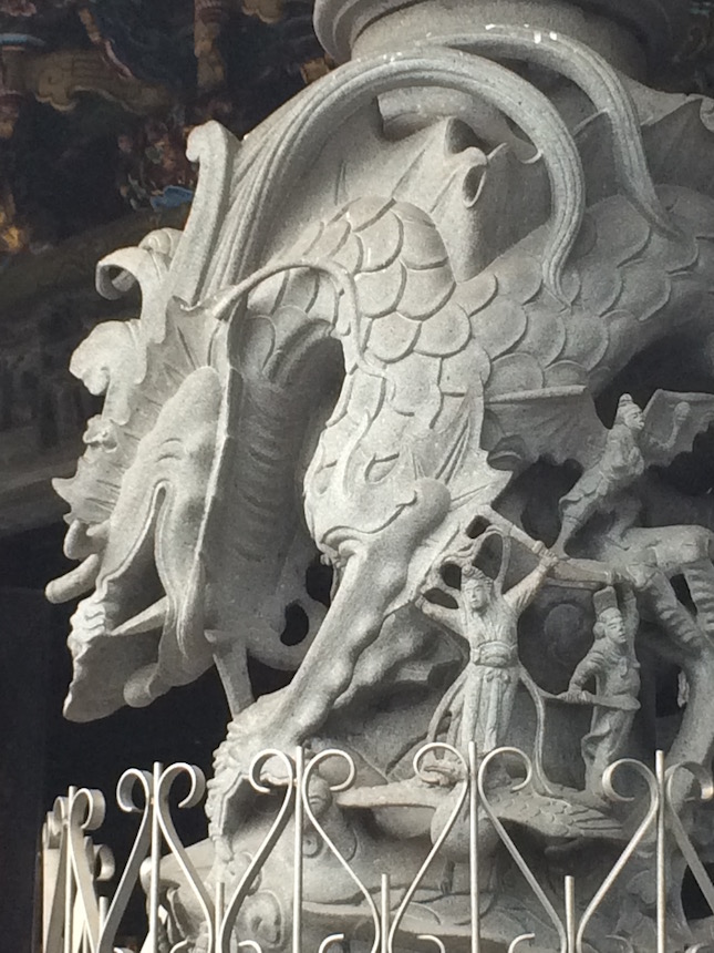 When visiting temples in Taipei, I’ve learned to look up at the top of the Dragon Columns that often mark the main entrance halls. These beautifully carved stone columns each show a large dragon spiraling upward to welcome worshipers (dragons are fierce but good). The dragons are usually interlaced with smaller figures, clouds, and birds, and frequently near the top, intriguing characters riding cranes or phoenixes. They represent more than the “longevity” that cranes imply, and very likely depict specific identities of the Eight Immortals of Taoist lore. In Taipei I’ve found quite a few of these magical bird-riding heroes and heroines, who were said to transcend the human state and gain supernatural powers they used to help the common people.